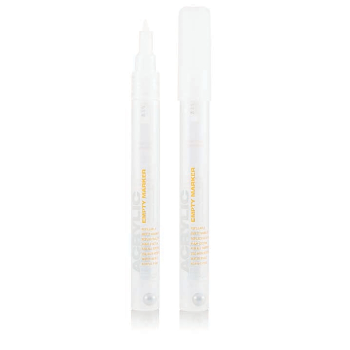 Tom marker som kan fylles med Montana tusj(refill), eller andre flytende farger som FW fra Daler-Rowney, HighFlow fra Golden, o.a..
