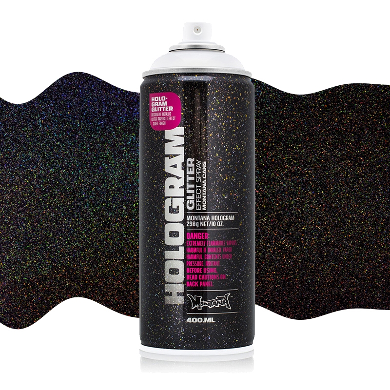 Hologram glitterspray er en glansfull, gjennomsiktig maling med både sølvfargede og fargede glitter-partikler som gir en metallisk effekt. Den brukes på mange ulike overflater som papir, papp, grunnet lerret, tre, glass, metall, keramikk, porselen, stein, akryl og andre malbare overflater.