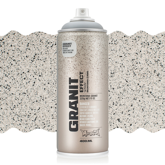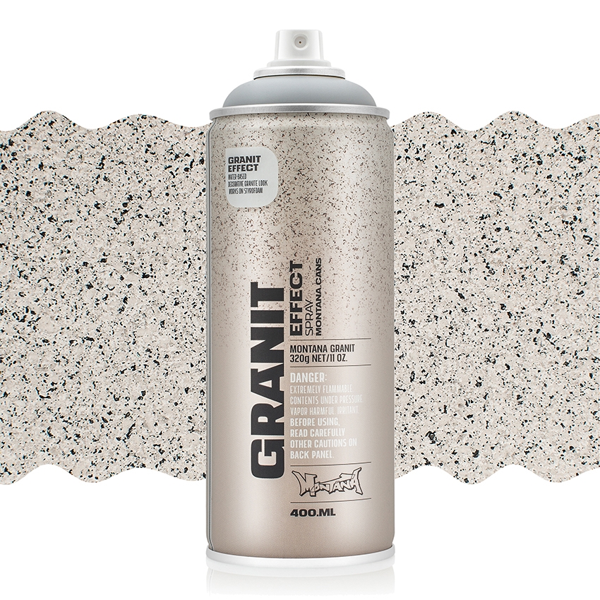 Montana Effect Granit er en vannbasert effektspray med fine plastpartikler som gir en realistisk granitt effekt. Kan brukes på en rekke ulike underlag; kartong, grunnet lerret, tre, glass, metall, keramikk, porselen, sten, akryl og andre malbare materialer. For optimalt resultat anbefales det at underlaget grunnes, spesielt om du bruker lys Granit Effect på mørkt underlag. Granit Effect tørker sent om du legger flere lag (opptil 24t), og den kan overmales med spraymaling eller en topplakk/ferniss.