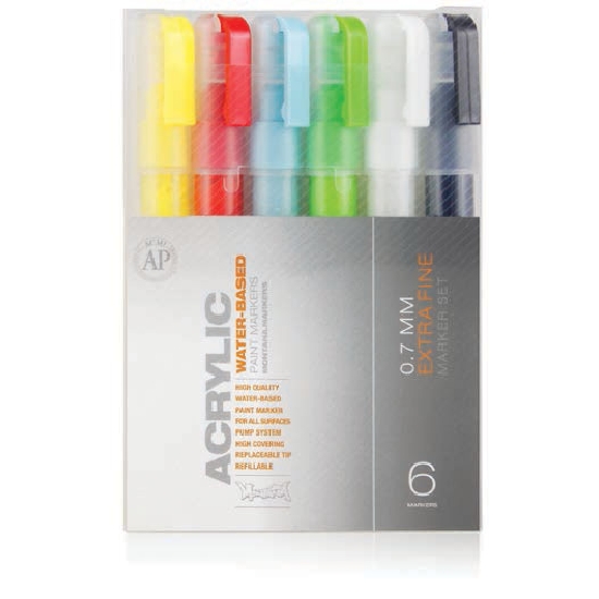 MONTANA acrylic marker 0,7mm EKSTRA FINE sett a 6 assorterte. Fargene: Shock Yellow, Shock Red, Shock Blue Light, Shock Green Light, Shock White og Shock Black
