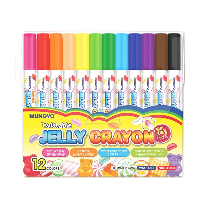 Mungyo Jelly Crayon er en ekstra myk vannløselig oljepastell for barn i 12 farger. Den kommer i et etui som gjør den enkel å holde for barn, og fargen kan skrus ut.