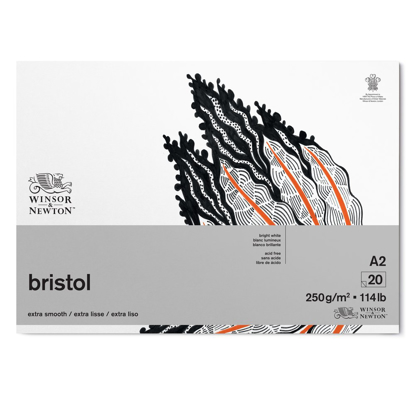 Winsor & Newton Bristol Board blokkserie med ekstra glatt, lyst hvitt tusjpapir. Blokkene inneholder papir på 250gr. og 20 ark. Papiret er ideelt for fine detaljtegninger og illustrasjoner med blyant, teknisk penn, tusj, blekk og airbrush. Papiret er 100% syre- og trefritt, med en sterk overflate som tåler gjentatt bearbeiding, visking og lette strøk med maling uten å bølge seg.
