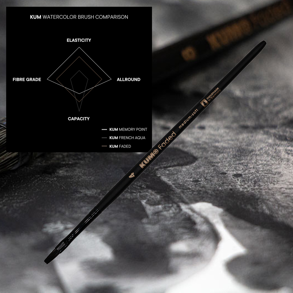 Kum Faded Akvarellpensel Flat 4, bustlengde 9, bredde 4,5mm. Akvarellpenslene fra KUM faded er utstyrt med et matt svart skaft som gir penslene et elegant, minimalistisk og tidløst uttrykk.