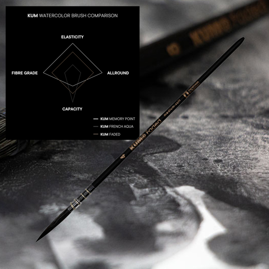 Kum Faded Akvarellpensel French Rigger 4, bustlengde 30mm, bredde 4mm. Akvarellpenslene fra KUM faded er utstyrt med et matt svart skaft som gir penslene et elegant, minimalistisk og tidløst uttrykk.