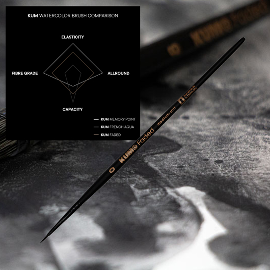 KUM Faded Akvarellpensel Round 0, bustlengde 8mm, bredde 1,8mm. Akvarellpenslene fra KUM faded er utstyrt med et matt svart skaft som gir penslene et elegant, minimalistisk og tidløst uttrykk.