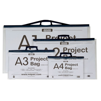 Project Bag fra Mapac, en enkel arbeids- og arkivmappe med bærehåndtak. Project Bag er i kraftig plast (polythene) og hver bag inneholder en plate med kartong.