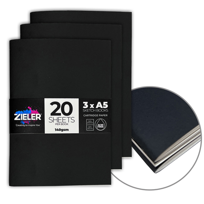 Soft-Cover skissebøker fra Zieler. Mykt, sort omslag. Hver skissebok inneholder 20 ark med glatt, syrefritt hvitt papir på 140 gr. Egner seg til alle typer tegning og skissing, samt lette strøk med maling.