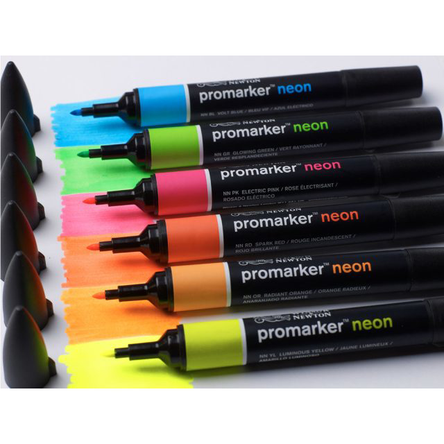 Promarker Neon fra Winsor & Newton kommer i 6 neonfarger og inneholder vannbasert tusjblekk. Den har en rund og en fin spiss. For best resultat bør den brukes på tusjpapir.