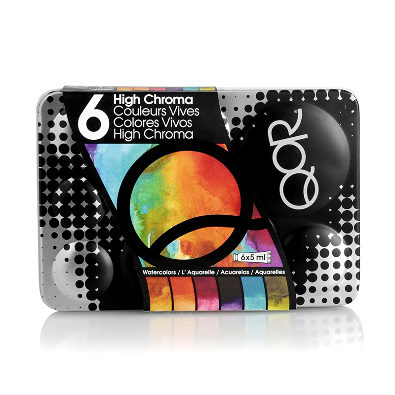 QoR akvarellmaling fra Golden med bindemiddelet Aquazol.QoR uttales «kår» og er en ny type akvarellmaling med et bindemiddel som normalt brukes som medium til å konservere bilder: Aquazol. QoR har høyere pigmentstyrke enn tradisjonell akvarellmaling, og gir klare, intense farger som holder seg like livlige når de tørker. QoR akvarellsett 6 x 5 ml - High ChromaSett med 6 stk. tuber i 5ml.