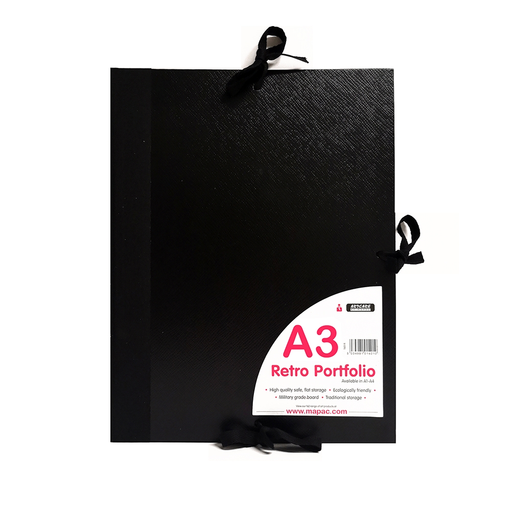 Sort, pen portfoliomappe i retro stil. Den har 3 klaffer og knyting, og egner seg godt til tegninger, skisser og andre dokumenter.