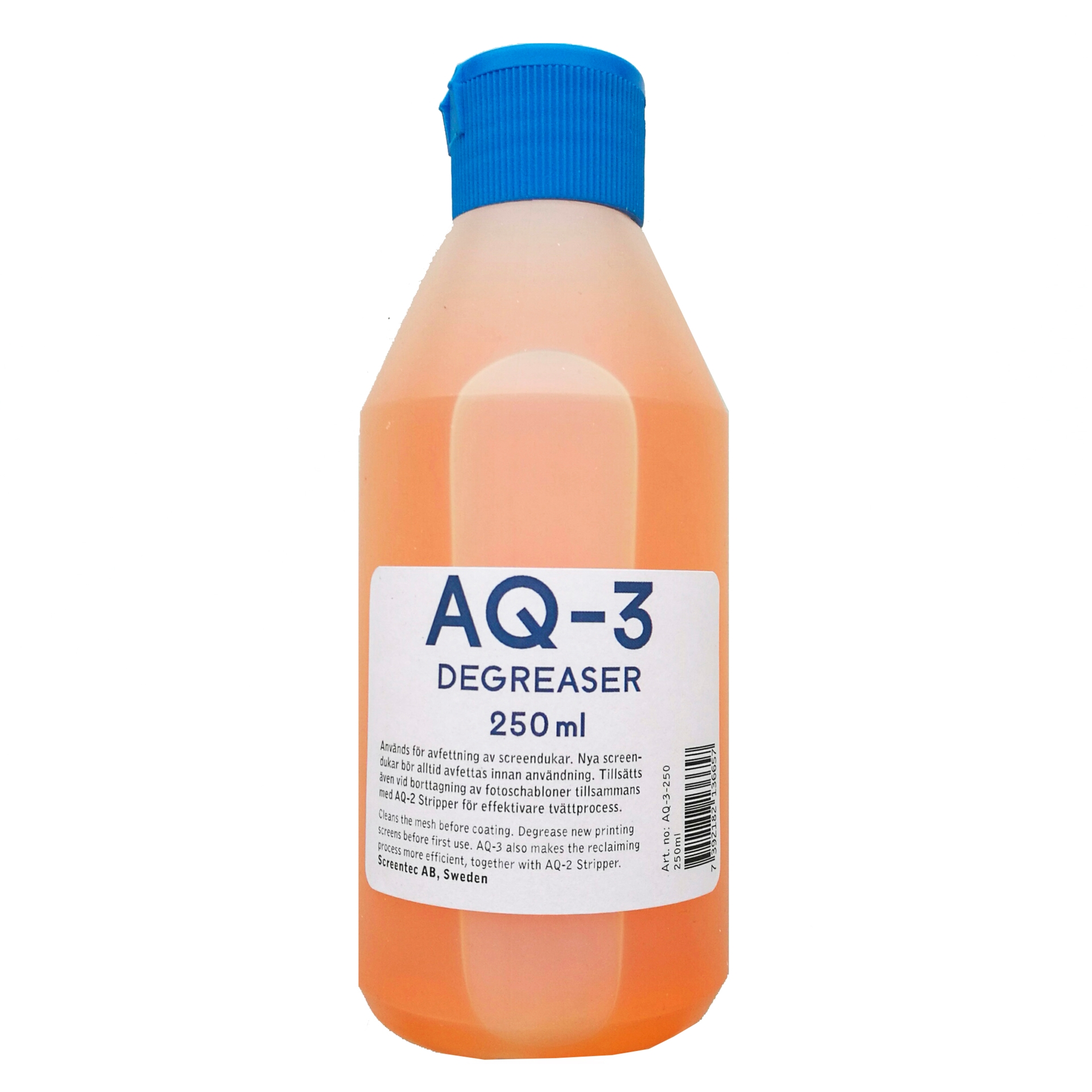 Avfettingsvæske for silketrykk i 250 ml. Avfetting av rammen skal gjøres før fotoemulsjonen blir påført. Dette for at emulsjonen bedre skal feste seg og fungere bra. Avfettingsvæsken er vannbasert.