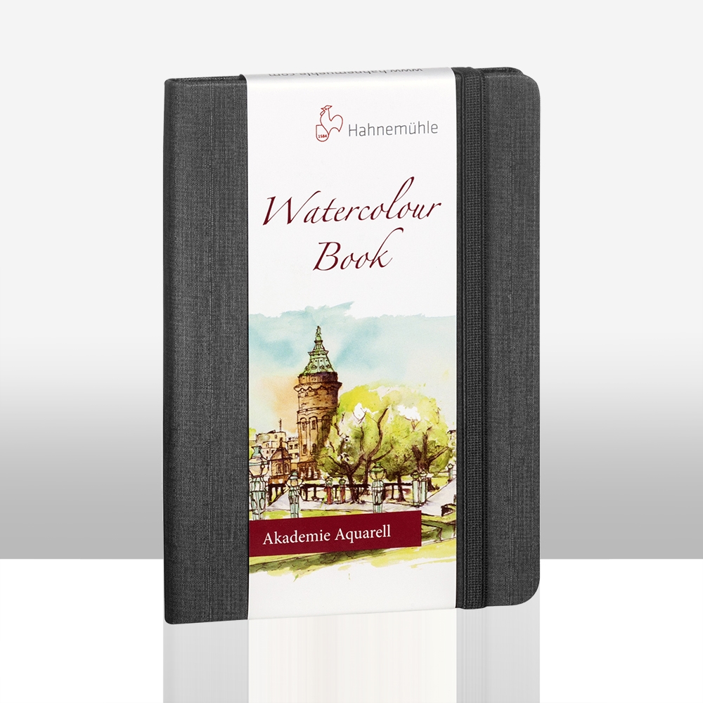 Watercolour Book fra Hahnemühle. En flott innbundet skissebok med Akademie akvarellpapir. Boken har et solid omslag med gummistrikk på utsiden og rød tråd inne i boken.