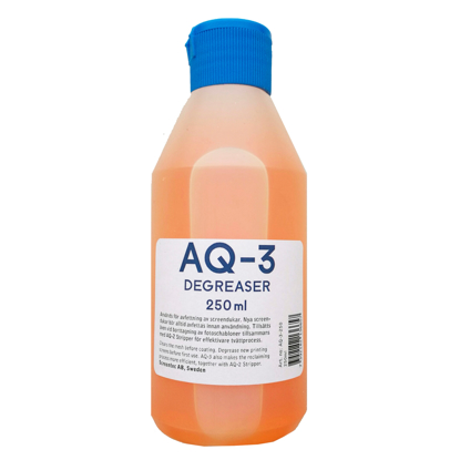 Avfettingsvæske for silketrykk i 250 ml. Avfetting av rammen skal gjøres før fotoemulsjonen blir påført. Dette for at emulsjonen bedre skal feste seg og fungere bra. Avfettingsvæsken er vannbasert.