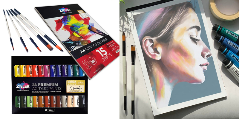 Zieler Acrylic Paint Set er et høykvalitetsprodukt som inneholder premium akrylmaling. Malingen er spesialutviklet av artister for artister. Både hobbyister, profesjonelle, studenter og barn vil elske allsidigheten i denne akrylmalingen. Et supert malingssett for å forfølge lidenskapen din. Akrylmalingen passer for de fleste malbare overflater, inkludert strukket lerret, tre, kortdekorering, håndverksskum, dekorativ tapet, terrakotta, tavlestaffeli, papir, tegnetavle og mer!